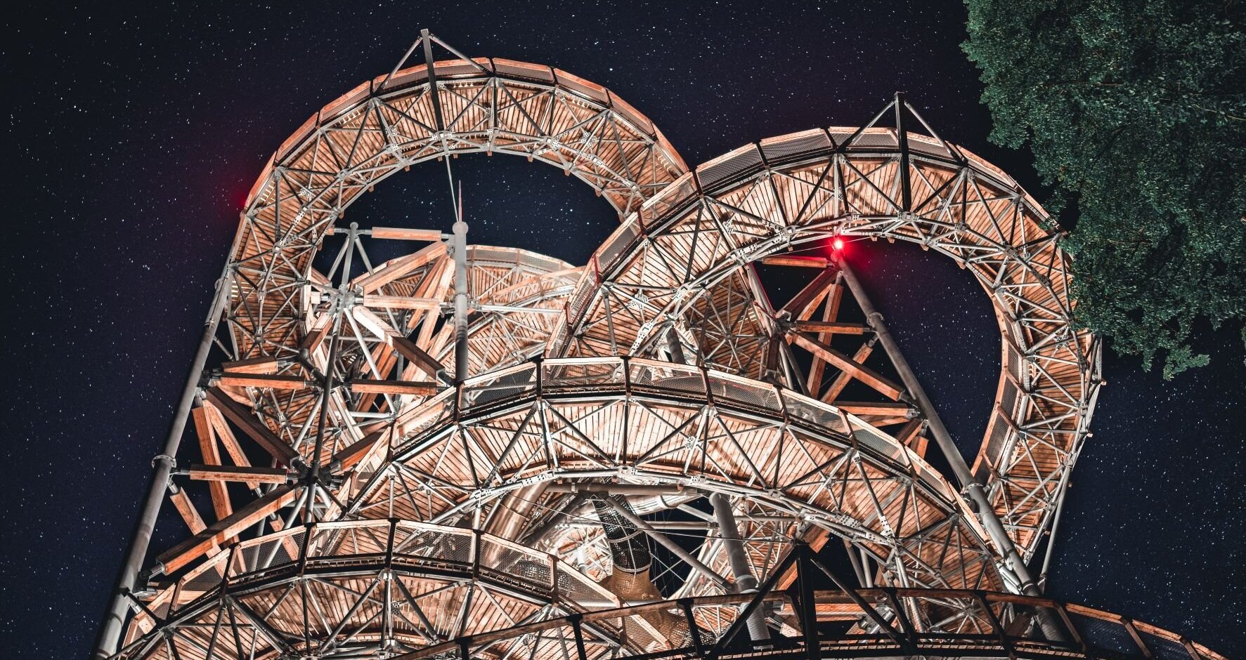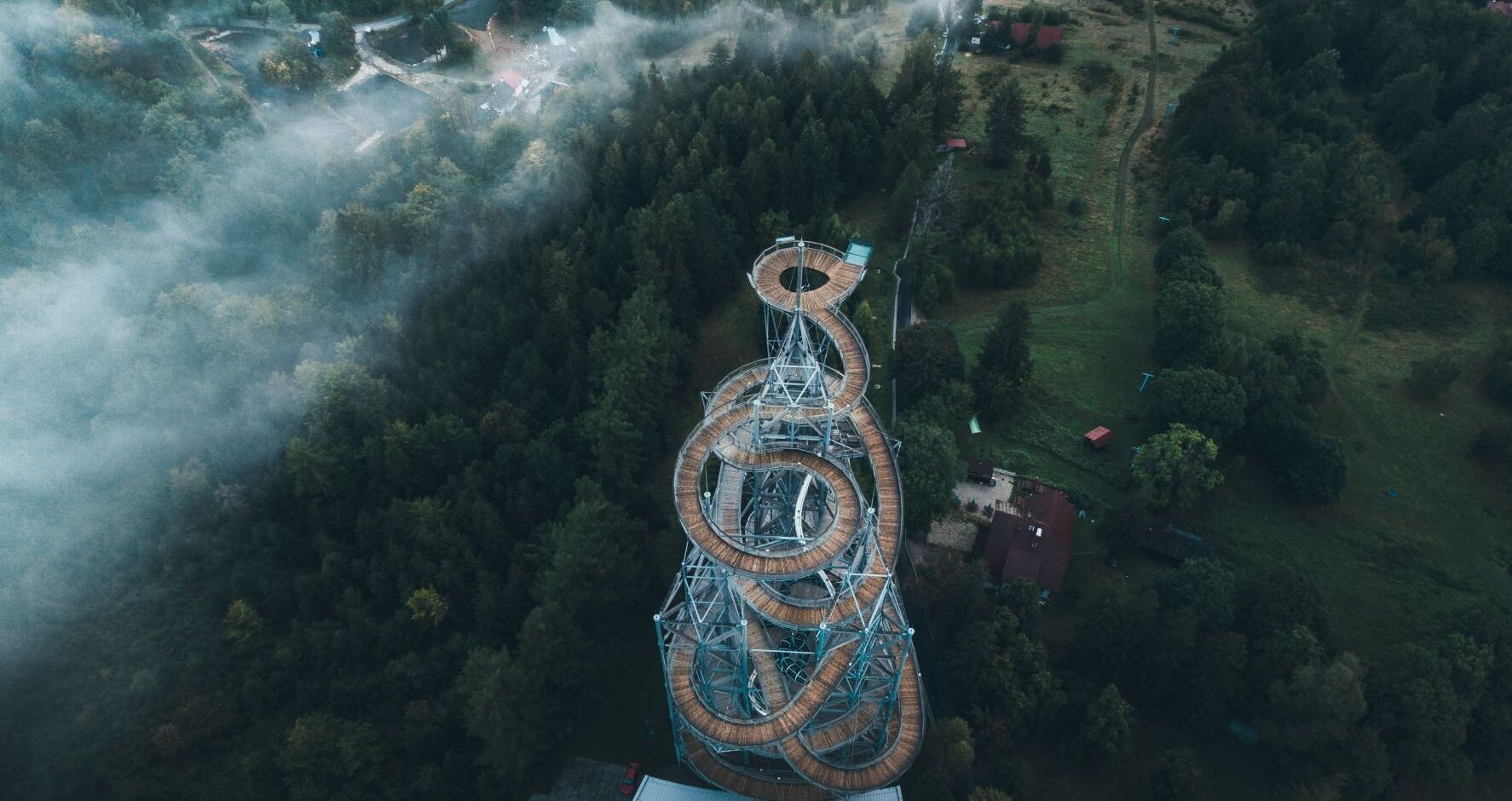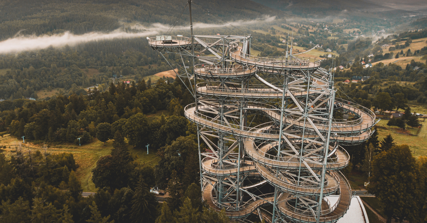 The Sky Walk observation tower was designed by Czech Professor Zdeněk Fránek. To make it accessible to as many visitors as possible, the tower was situated above the city, on the slope of Świeradowiec Mountain. At its summit is a glassed platform with an amazing vantage point. Getting to the top of the tower requires crossing an 850-meter footbridge, but you can make the return journey using a 105-meter-long slide.